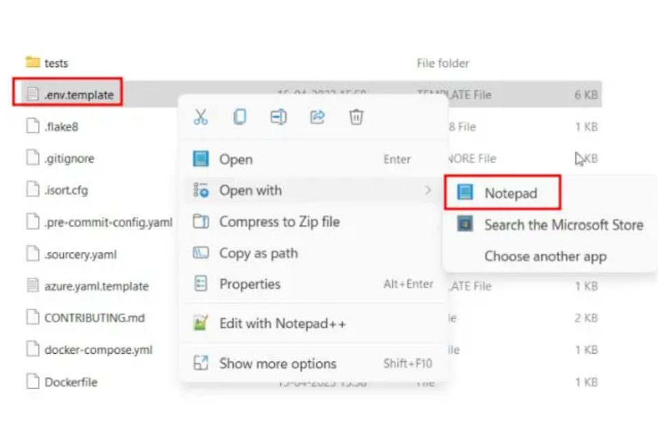 4. Now that the folder is open, look for a file with the extension “.env.template” Use Notepad or another text editor to read it.