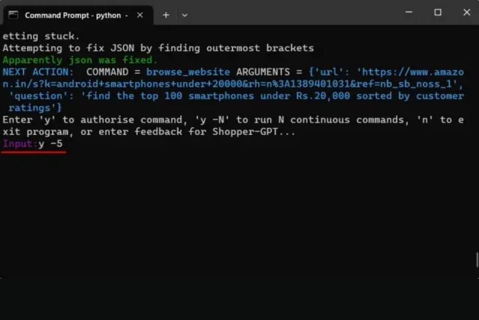 Here you need to provide the AI name, role and goal that it needs to accomplish for you. For command, let’s say android smartphones under 20,000. Entering “y -5” will set it to run for the following five steps without further confirmation from you, which is useful if you want to let it run in the background while you do other things. Use the Ctrl C key combination to cancel the process.