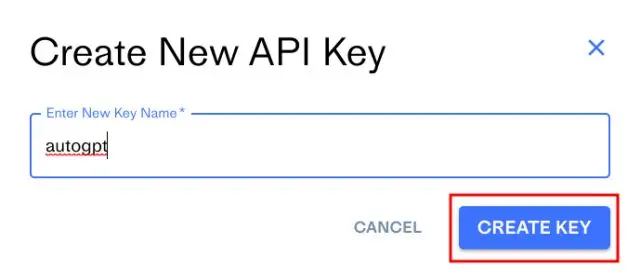 9. To generate a key, enter a name like “Auto-GPT,” then click the “Create Key” button.