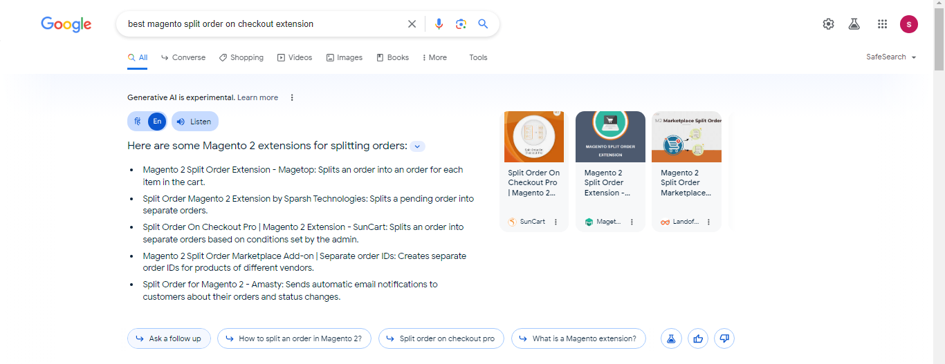 For example, if you search for the best Magento split order on checkout extension (a shipping order management extension for E-Commerce businesses), SGE generates a dedicated page with relevant information.