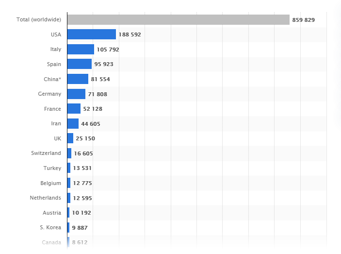 Number of novel coronavirus (COVID-19) cases worldwide as of April 1, 2020, by country* (from Statista)